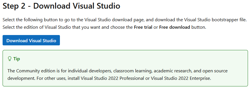 On this official documentation page from Microsoft, you will see a link under Step 2 to "Download Visual Studio":