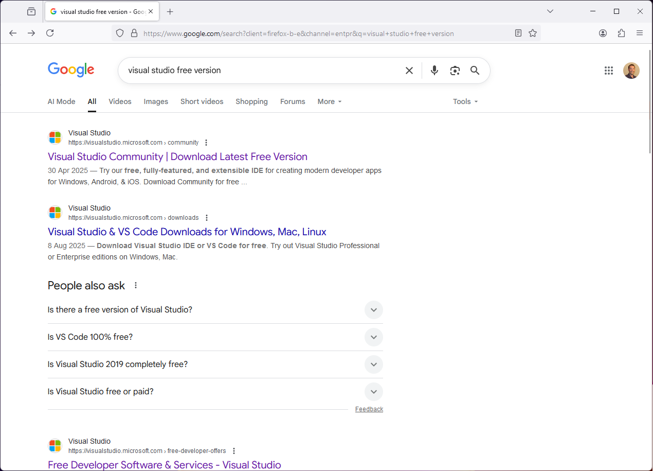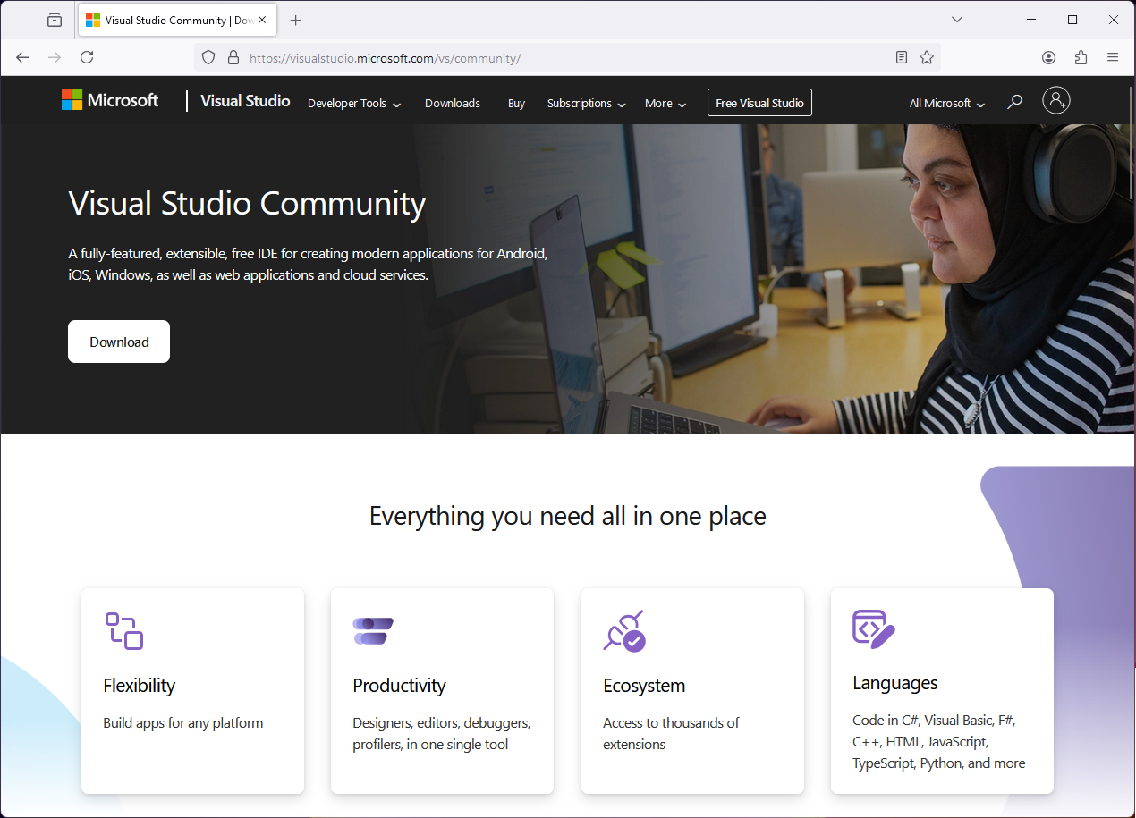 There are several different versions of Microsoft's Visual Studio - the Community version is free and includes all of the necessary libraries and tools that we need to develop C programs. You can google "Visual Studio Community" to find out more, or go directly to the relevant page on Microsoft's website: