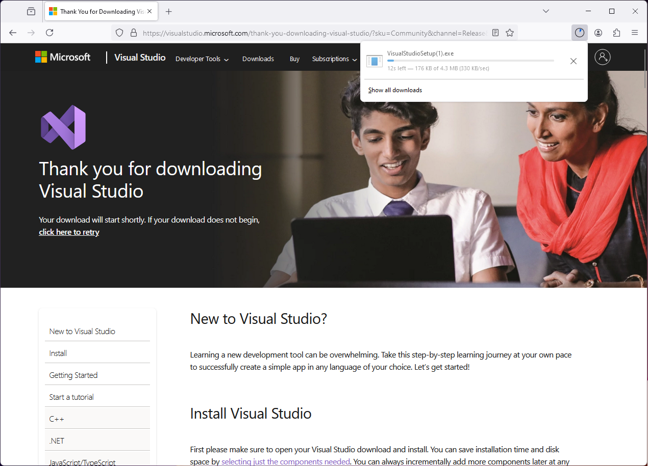 Clicking on "Download" will result in a file (VisualStudioSetup.exe) being downloaded to your machine: