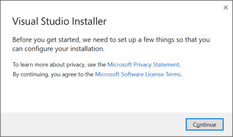 When you run the installer, you will need to acknowledge the Microsoft License Terms and the Microsoft Privacy Statement, and you can do this by choosing "Continue". You will then be prompted to customise your installation by selecting the "Workloads" tab, as shown in the screenshot below: