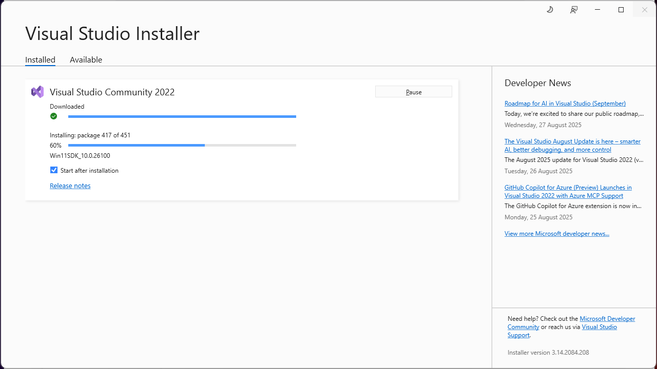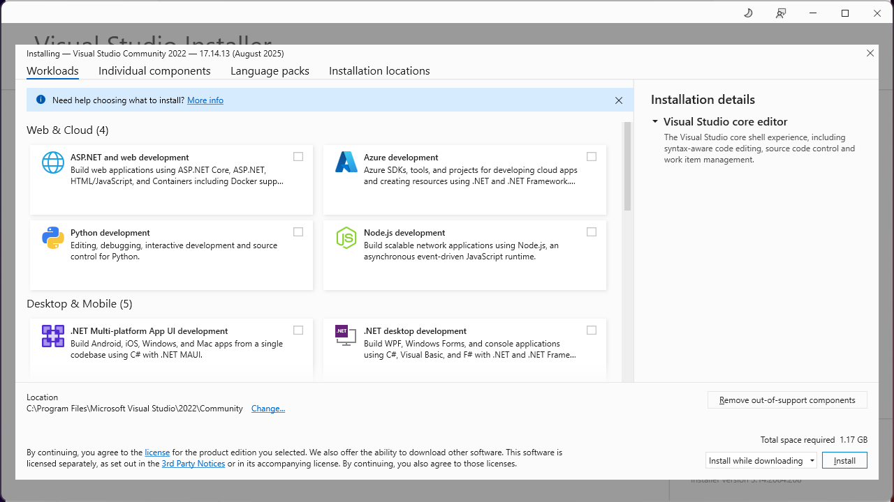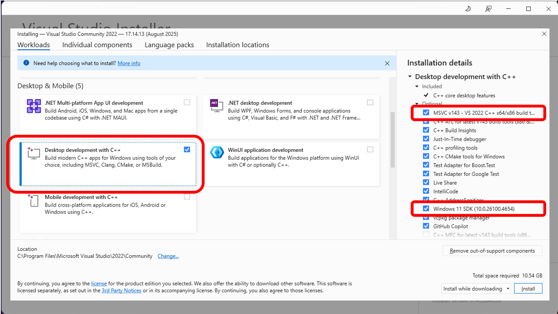 Software updates occur frequently and this makes it challenging to keep documentation up to date. Fortunately, the process for installing Visual Studio Community has remained fairly consistent over the years. In this section, screenshots for installing the VS Community on Windows 11 are highlighted, however the detailed documentation in the sections that follow (e.g. "2022 - Installing Visual Studio Community on Windows 10") should still apply and should be read in conjunction with these 2025 updates.