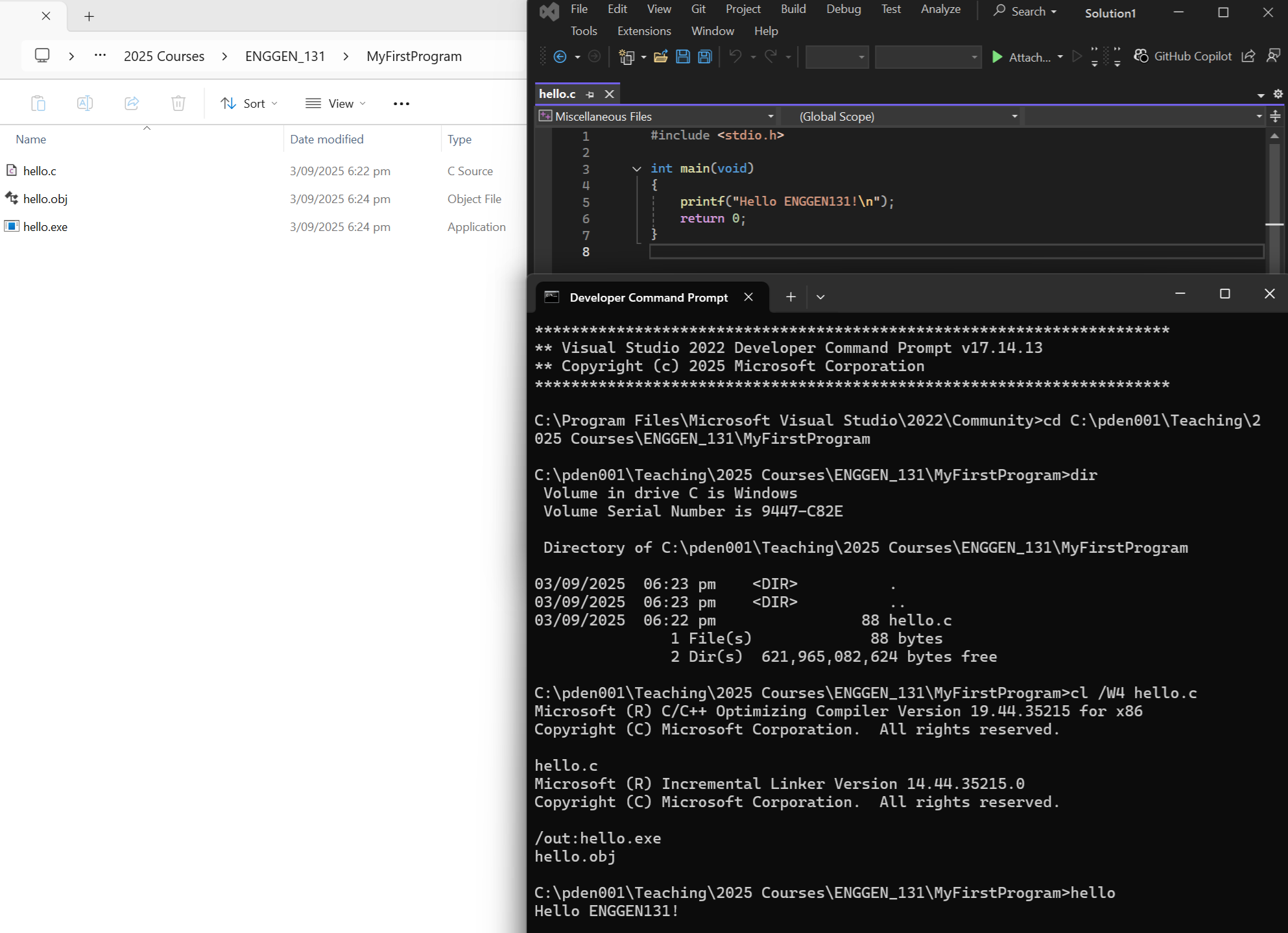 Great, now that Visual Studio Community is installed, you have two options for developing and running C programs on Windows. The first option involves using any text editor you like to write your source code, and using the "cl" command within the Developer Command Prompt to compile your code. The second option involves using Visual Studio Community as the development environment, and creating a Visual Studio "project" to organise your files.