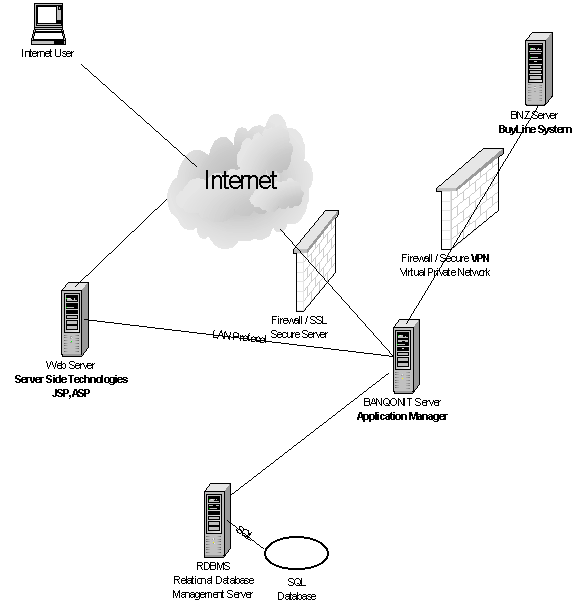 Second, we shall design an application manager that will include functions to maintain and manipulate data out of the relational database schema. This application must be able to communicate with the existing BNZ BuyLine System as well as other equivalent BuyLine applications from other banks, which will provide validating and processing of transactions, It must also provide functions for the current BANQONIT system e.g. batch files uploads, viewing past transaction reports etc, and for proposed enhancements e.g. customer refunds, Pre-authorisation etc.