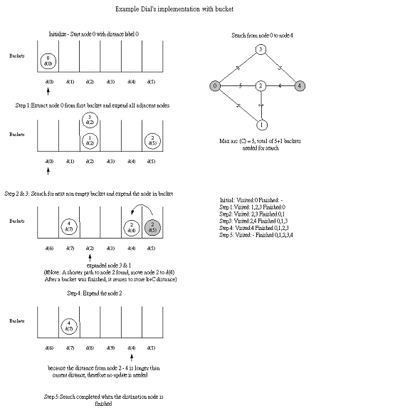 Dial's implementation is a Dijstra's algorithm implemented on a different data structure. Nodes store in buckets to reduce the node selections time Buckets are sets arranged in a sorted fashion, a bucket only stores the node with a same distance label In Dial's implementation, bucket k contains all temporarily labeled nodes whose distance labels are equal to k. Buckets numbered 0, 1, 2, 3, ...C, are checked sequentially until the first nonempty bucket is identified. Each node contained in the first nonempty bucket has the minimum distance label