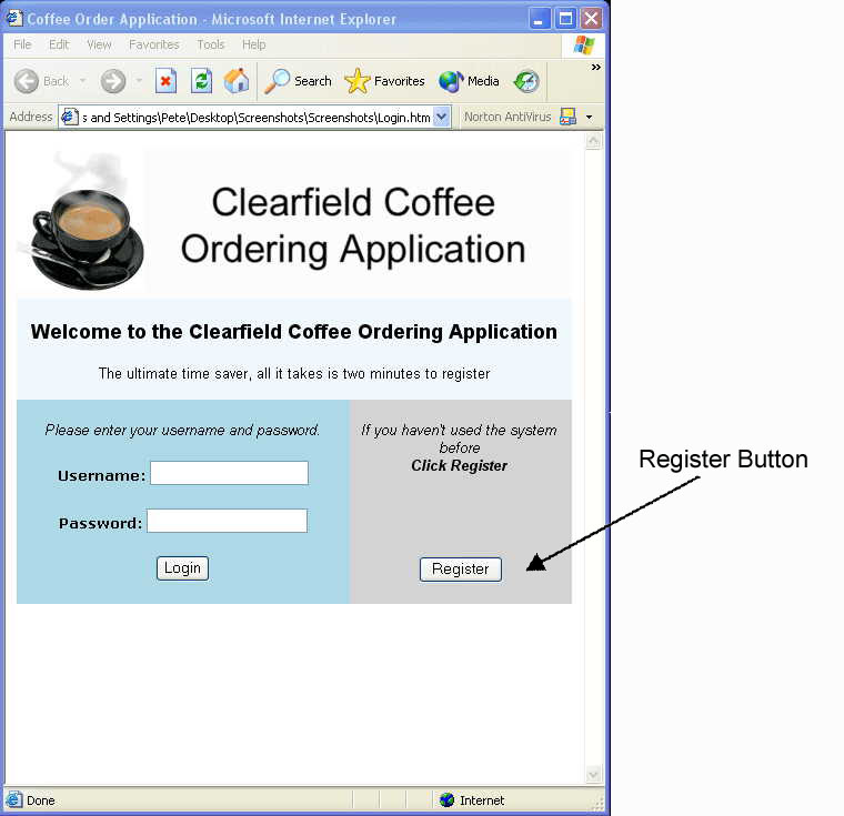 This is the ‘login screen.’ You will see it every time that you start the Coffee Ordering Application. Now that you have a username and password, you can login and begin using the application.
