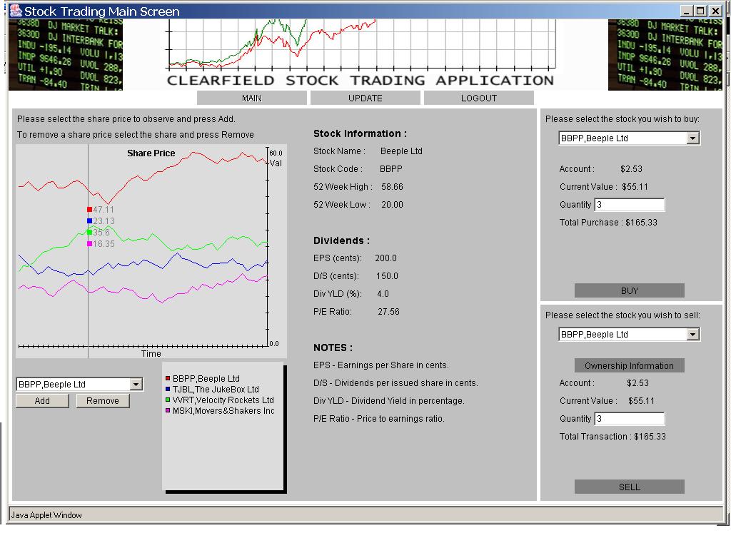 The process of selling stocks is almost identical to that of buying. Select the stock you wish to sell from the drop-down menu in the bottom right hand corner of the main screen, enter a quantity and press the “sell” button. A message will appear confirming the sale.