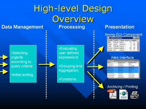 - Data Management - In this case will be acting on Java objects (rather than a database). This layer is concerned with selecting objects for the report, sorting, and updating where appropriate.