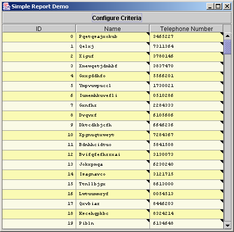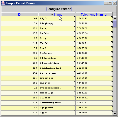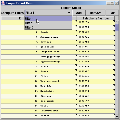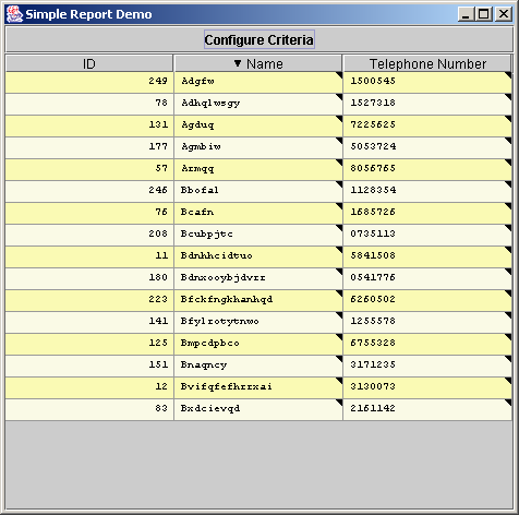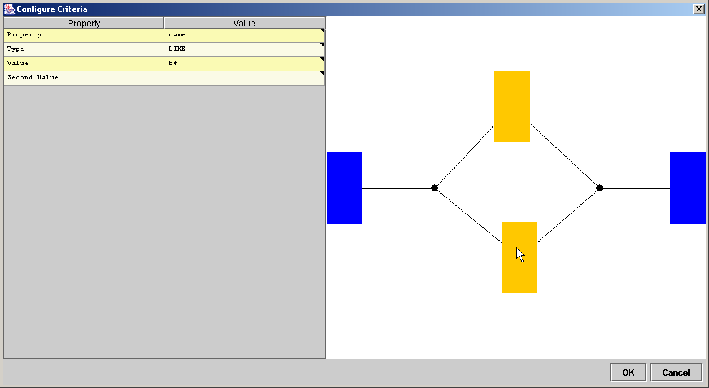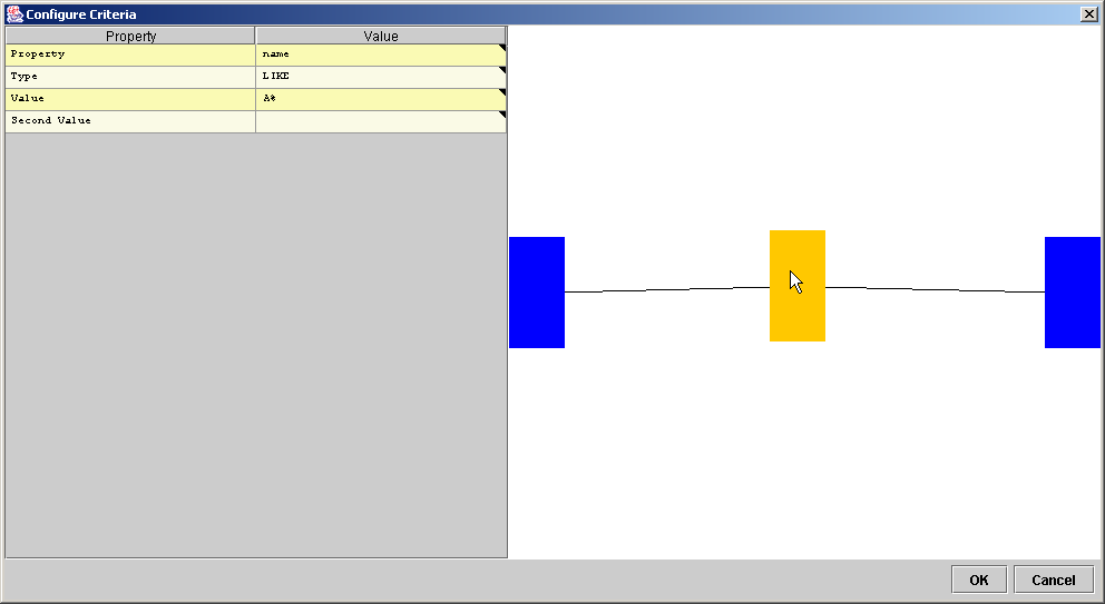 When the filter editor is closed, the rows which match the given criteria are displayed. In the diagram below, only those objects where the name is LIKE 'A%' OR name is LIKE 'B%' are displayed.