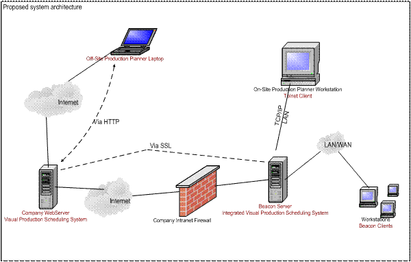 of Proposed System Our proposed system (Internet Enabled Visual Production Scheduling System) will revolutionize the way the production planner schedules and allows the user to interact with the system in a true graphical interface. We have decided to transform the capacity and work load scheduling processes to allow users to interact visually with the system. The aim of this project is to develop an effective, easy to use, scheduling system to optimize production management. Beacon already provides detailed capacity planning and work load scheduling processes. To use these requires that data, such as dates, quantities, queue times etc are changed and that results in the rescheduling of the job(s). We will allow the user to view the loads on the resources that are used to manufacture the parts on the schedule, then to “drag and drop” that load. We will show the load on each work centre as a bar representing the time this job will take on a particular machine, similar to a row in a Gantt chart. The back end processes that keep the corporate data will be updated by these changes as though the dates and times had been keyed into the jobs schedule. Dynamic scheduling will alert the appropriate personnel when an order might be late or more resources will need to be acquired. The project will be fully functional through a browser, aimed at Microsoft’s Internet Explorer at release 6 level in addition to being accessed through the wide area network. Technical Specifications (Platform): The proposed system have the same platform as the current system with the following changes: