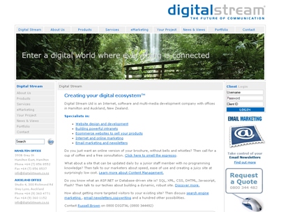 Digital Stream Ltd is an Internet, software and multi-mediadevelopment company with offices in Hamilton and Auckland. Specialists in: Internet Marketing Creating user-friendly websites Building powerful Intranets Hosting email marketing projects --------------------------------- If you want more info on them check out their home page |