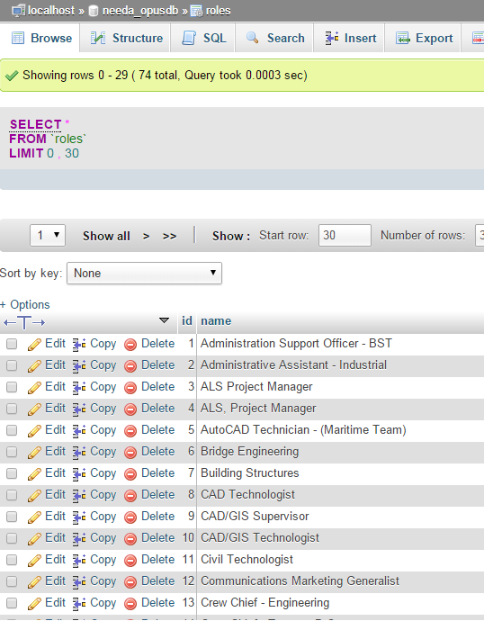 The MySQL database was created with the roles table containing a list of roles and IDs.