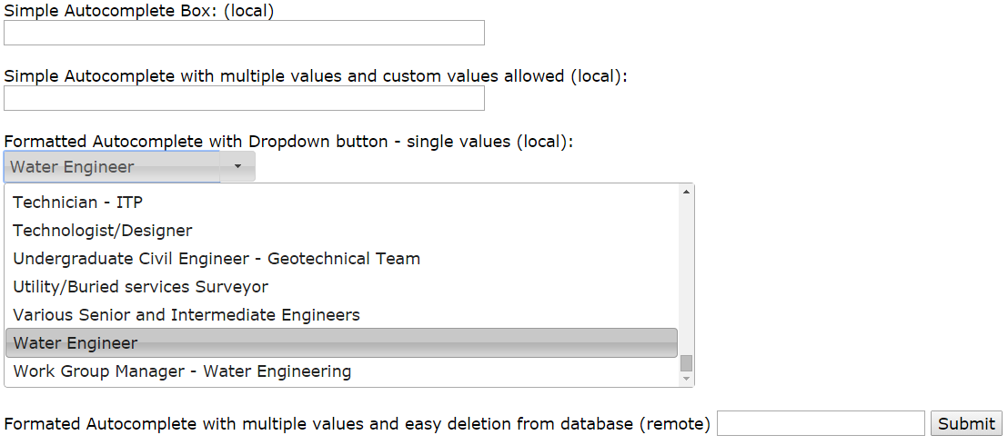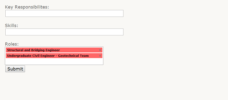 The boxes were either retrieving data from a local MySQL database or were hardcoded into the HTML - but all four options could be configured to retrieve data from a database - the hardcoding was done for simplicity and as a proof of concept. From all the four options - the options that allowed multiple values seemed to be the best fit, since it allowed users to select multiple values from a predefined list. Being able to select these multiple features is handy for something such as roles if a person is for example a "Structural Engineer" and a "Water Engineer". Also the last option allows users to delete values which is a bonus. Something I would need to add though is to allow custom values - if in the case a user fits into none of the options then I should be allows custom values to be entered and saved. Also I will make sure all the forms I am using now are accessing their data sources from the database and are not hardcoded.