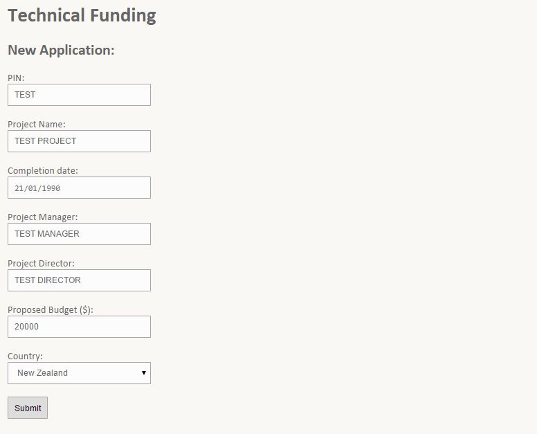 A screenshot of the technical funding applications page where a user can submit an application for funding. All this data is saved in the database, and upon submitting the data it is checked to ensure it is valid.