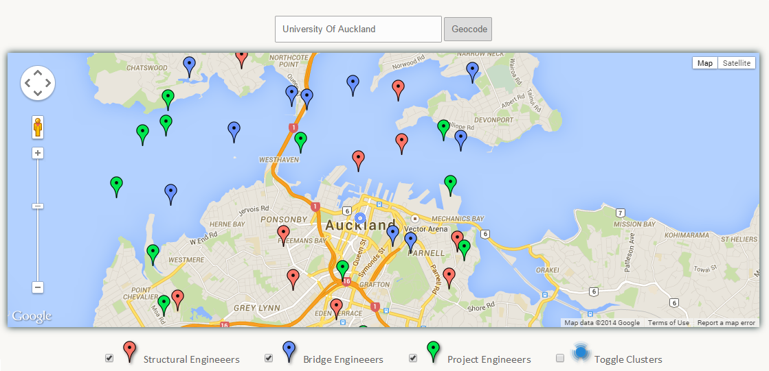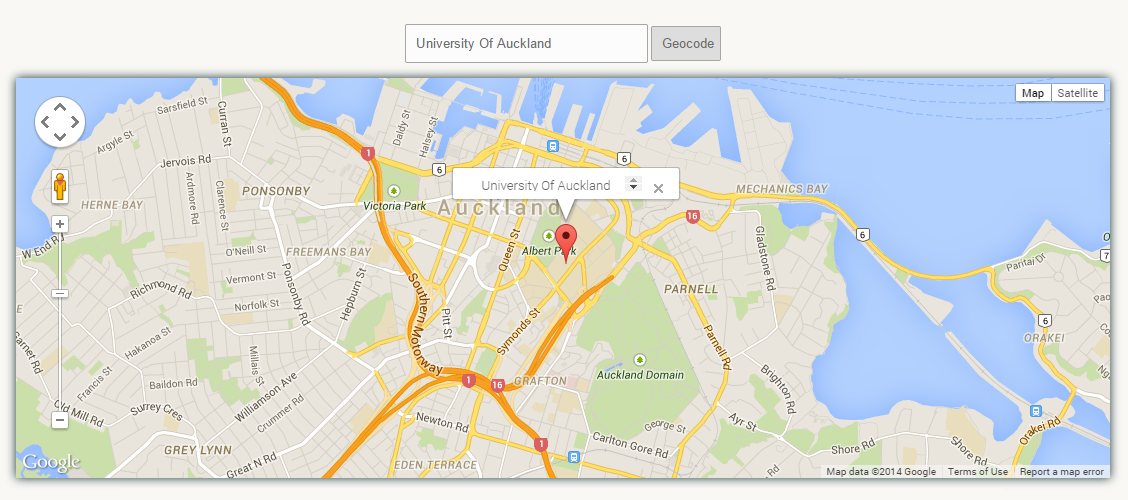 In the week I also started on the mapping application. This uses the Google Maps API and HTML5 and primarily Javascript in order to embed Google Maps on a webpage. The webpage shows your current location and using Google's API can also perform a reverse geo-coding search. So if a user searches for The University of Auckland, that gets sent to Google's servers which converts the address into a latitude and longitude which is sent to me and then displayed on the Google Map.