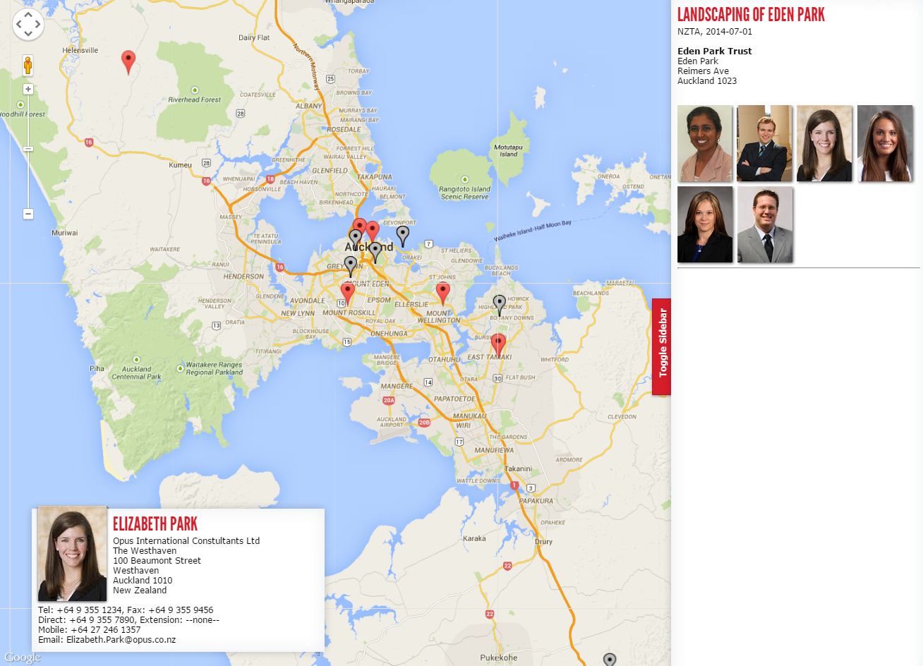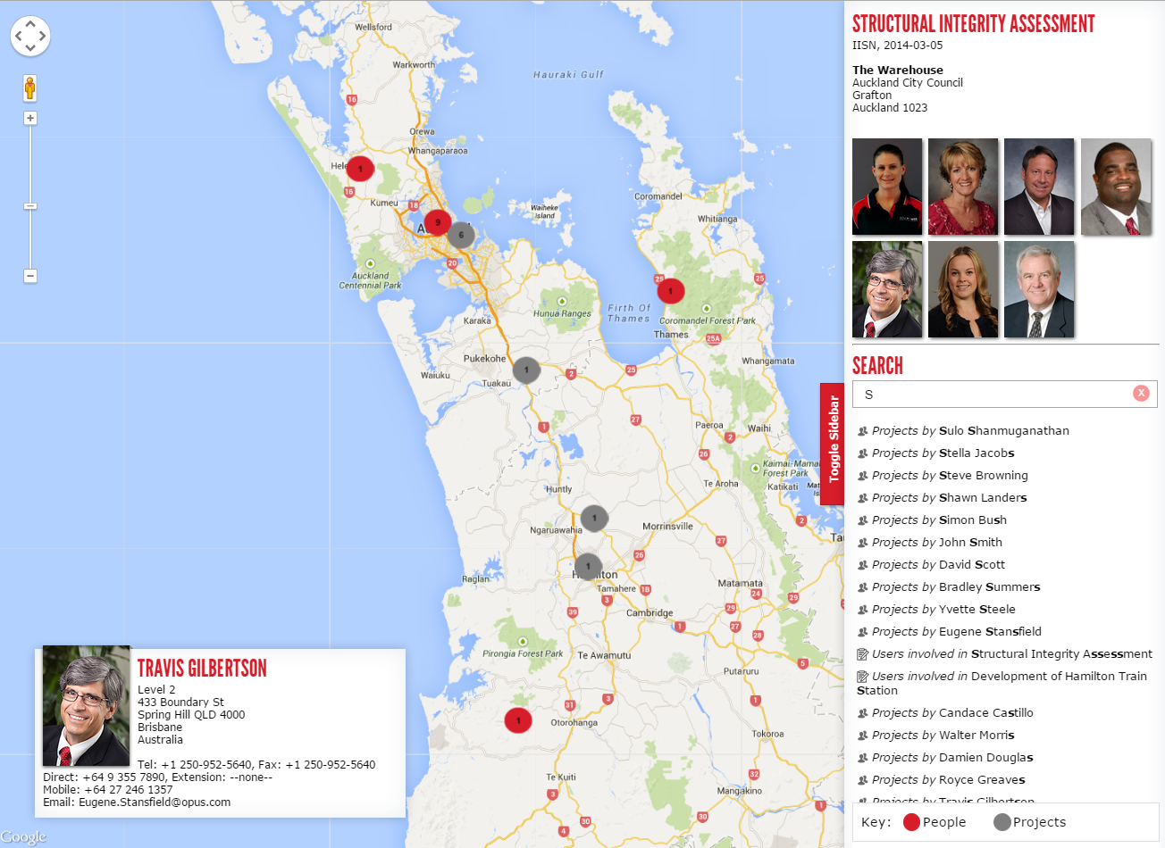 Screenshot of the updated maps application. Supports universal search of people, projects and locations and also has distinctive map marker clustering between people and projects. Skills is the last feature that needs to be added.