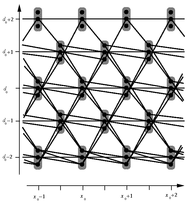 The GPV in Figure 4 with a narrow "tube" of x-disparities demonstrates both the uniform internal transitions and specific uppermost/lowermost transitions to ensure the equilibrium conditions are preserved in all the nodes. Let M substitute for M1 or M2 so that the transition probabilities are Pr(B|B) = p(B|B); Pr(M1|B) = Pr(M2|B) = p(M|B); Pr(B|M1) = Pr(B|M2) = p(B|M); Pr(M1|M1) = Pr(M2|M2) = p(M|M), and Pr(M1|M2) = p0(M|M). The equilibrium conditions suggest that each node in a profile has the same marginal probability of the visibility state Pr(B). Thus the transition probabilities and the resulting marginal probabilities of the visibility states in the profiles are expressed in terms of the two transition probabilities p(B|M) and p(M|B) as follows: