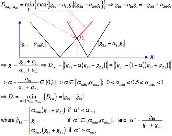 For the assumed image model, the dissimilarities of the corresponding signals from the cyclopean signal in the GPV-node with the visibility state B are |g1:i − a1:igi| and |g1:i − a1:igi| where (a1:i, a2:i: i = 1,2,…,n) is a sequence of the transfer factors. Given these factors, the simplest estimate of the unknown cyclopean signal is obtained by minimising the maximal of the two node-wise dissimilarities: