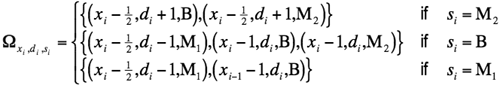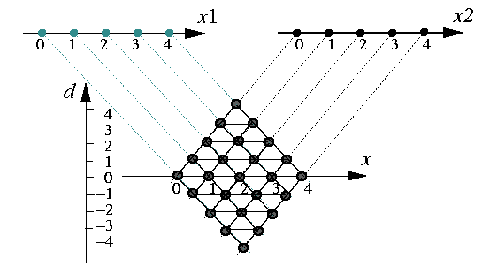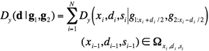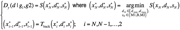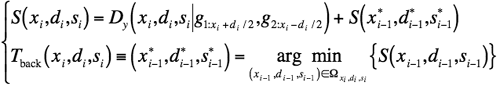 Dynamic programming (DP) exhausts all the profiles under the constraints Ω and finds the profile giving the global minimum of the total dissimilarity. The search involves a successive pass along the x-axis of the GPV. At any current location xi, all the possible GPV-nodes (xi,di,si) are examined in order to calculate and store, for each node, the local, potentially optimal (provided that this node belongs to the optimum solution) backward transition to one of the preceding nodes specified by the set Ω. Let S(xi,di,si) denote the sum of signal dissimilarity values along the whole potentially optimum backward path for every node (xi,di,si) where i = 1, 2, …, n; di = dmin, dmin+1, …, dmax, and si = M1, B, M2. Then the basic recurrent DP computation is as follows: