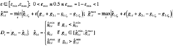 Spatial interdependence of the transfer factors along the profile is more naturally taken into account if one chooses the floating rather than fixed range of the factor for each point i depending on the neighbouring factor along the profile. The floating range constrains deviations of the differences between the cyclopean signals in neighbouring BVPs along the profile transferred to the images (below, i′B is the index of the preceding BVP being closest to the BVP i):