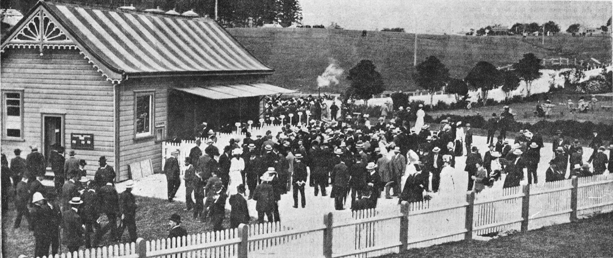 We do not know how inclement weather was handled initially but, once clubs had the monopoly, it was not long before special permanent buildings were constructed from which to operate the machines. These often had more than one machine to handle the demand. Typically, the early buildings would have a veranda to shelter the machines, their operators, and the punters at the head of the queue. We have one nice image from Wanganui - the gentleman at the right distinguished by his white jacket is Mr George Spriggens, the manager of the totalisator, who ran the totes in the area for many years.