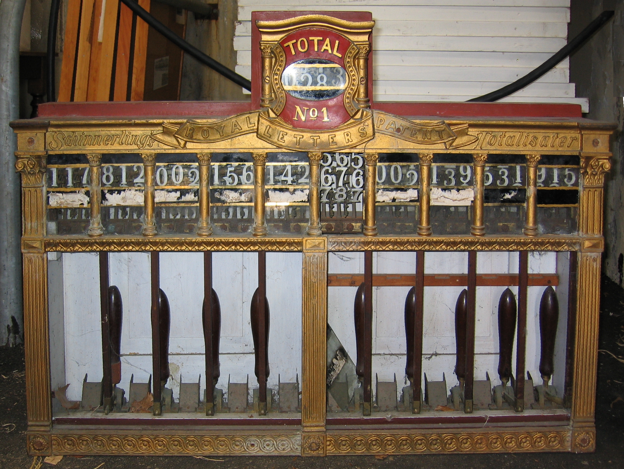 The early totalisator machines were considered to be in competition with bookmakers and were operated on the same scale by one man or a small team. The first machines were human sized - some were quite small and portable, others more like the size of a piano. The counts of bets were shown in large, easy-to-read, professional-looking fonts rather than handwriting. The typical machine would have levers to increment the count on each horse and to increment the grand total as well in the sight of the gamblers. Some machines would have locks set so that there could be no tampering while the race was being run. A typical machine would be like one of the two held in the Otago Settlers Museum on the left or another stored Ellerslie to the right: