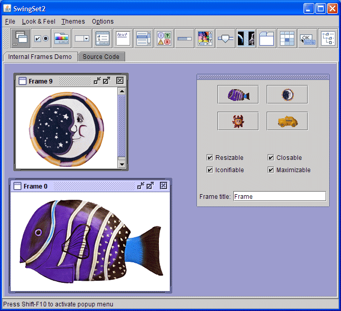 In your JDK 6 installation, there is ademo\jfcfolder that contains a demonstration program calledSwingSet2. This program has a graphically rich GUI and allows you to change the Look and Feel from the menu. Further, if you are using the Java (Metal) Look and Feel, you can choose a variety of different themes. The files for the various themes (for example,RubyTheme.java) are found in theSwingSet2\srcfolder.This is the "Ocean" theme, which is the default for the cross-platform Java (Metal) Look and Feel: