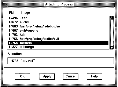 To attach to a process not currently under debugger control, choose Command:Attach to Process in the Main Window. This displays a Process Selection dialog box that shows you the list of active processes to which you have access (Figure 5-1).