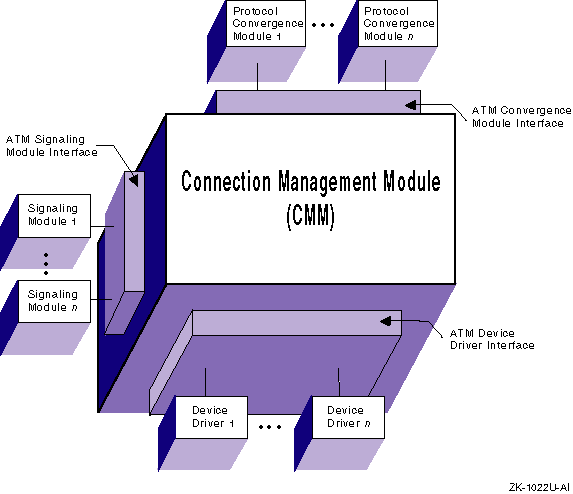 Provides interface points for other elements of the ATM subsystem, as well as the interfaces for accessing the ATM subsystem from kernel protocol stacks. These interfaces permit the modular addition of drivers, signaling modules, management modules, and protocol stack interfaces without having to make changes to the CMM.