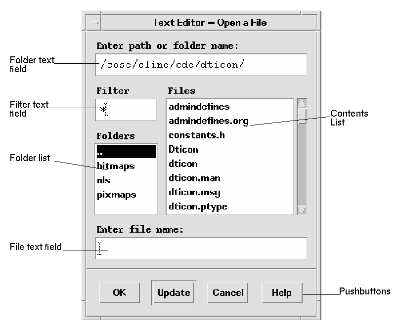 - When the file selection dialog box is used to choose an existing directory, there must also be an additional button, labeled Update, that is enabled whenever a directory is selected in the contents list, and opens the directory. This Update button is the default action. See link.