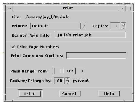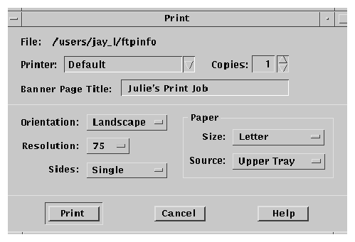 - Printer: A combination box; could also be a text field. It contains the name of the printer destination. The default entry is labeled Default, that is, whatever printer is the default destination. The user may select or type any other valid printer name. If it is a combination box, the list of printers could reflect what is appropriate for that printing job. The dialog should retain the last user entry or selection made.