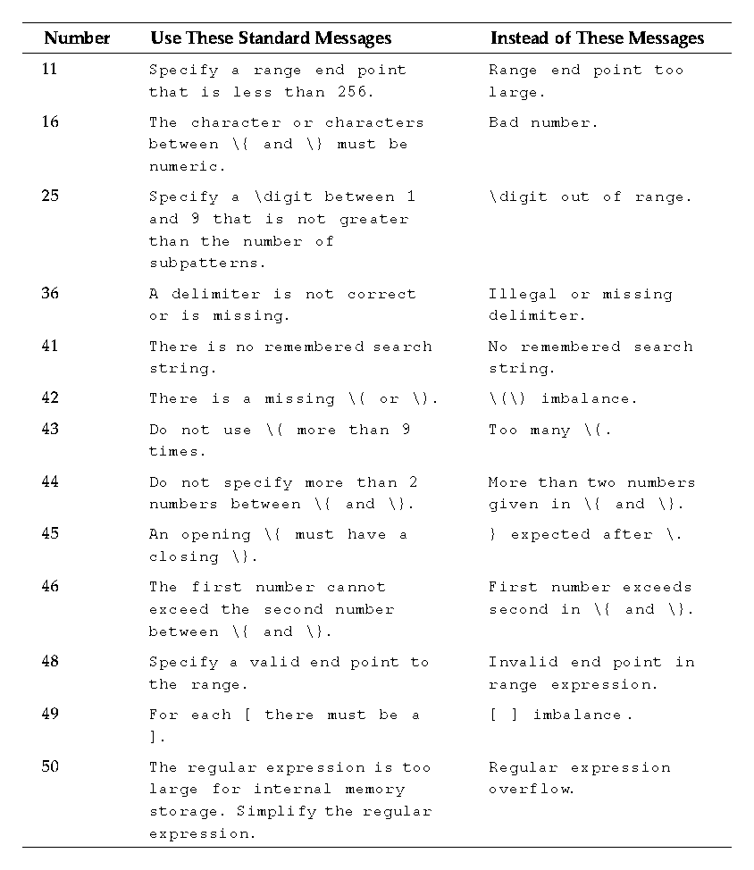 Table A-2 lists the standard regular expression error messages, including the message number associated with each regular expression error: