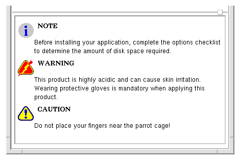 If you create your own icon images for notes, cautions, and warnings, be sure to keep them small so they will fit into the area allotted. Also, the graphic images must be in your HelpTag search path, which is specified in your helptag.opt file.