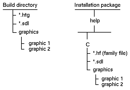 When the help files are installed, the graphics files must be in the same relative position as when the run-time file was built. Otherwise, the help volume will be unable to locate the graphics files. For example, if your graphics files are in a subdirectory named graphics one level below your volume.htg file, then your installation package must preserve that relative position. The graphics files must be placed in a subdirectory named graphics one level below the volume.sdl file.