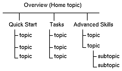 An author organizes help information into a logical framework. Most times, but not always, this results in an outline, or a hierarchy of topics. The topic hierarchy in Figure 1-8 consists of a main level, three sections, and subordinate topics. Although Help has been optimized for information that is organized in a hierarchy, you are free to create any kind of organization you want.