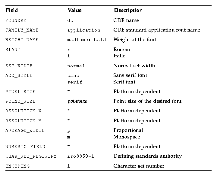 You encode them exactly as shown, complete with the * wildcards, in your resource definitions. By applying the wildcards to the numeric fields other than point size, you ensure that the resources match CDE fonts on all platforms, even if the exact pixel size or average width of the fonts is slightly different.