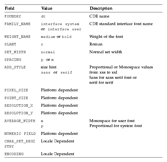 The standard names are available using the regular X Windows XLFD font- naming scheme. When properly specified with appropriate wildcards for the platform-dependent fields, a CDE font name is guaranteed to open a valid, corresponding platform-dependent font. The XLFD name returned from a call to the Xlib XListFont function, however, is not guaranteed to be the same on all CDE platforms.