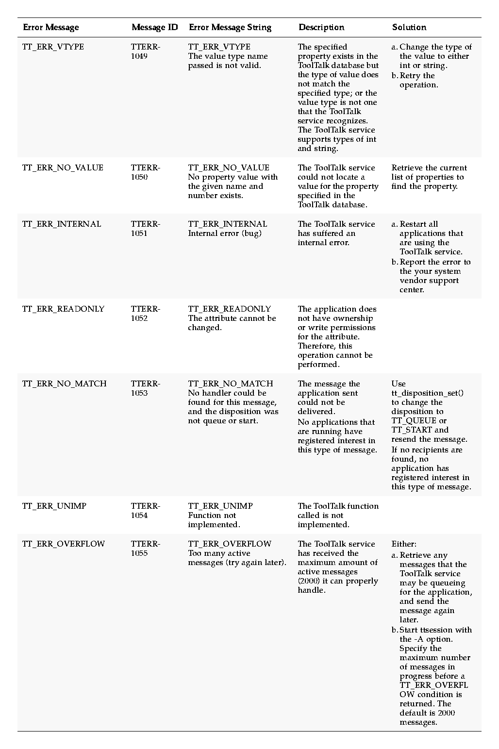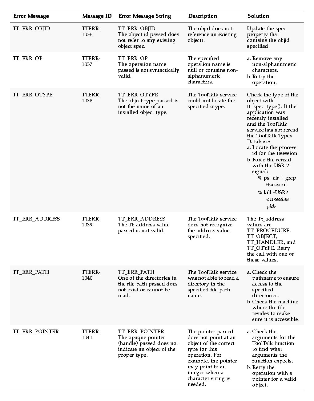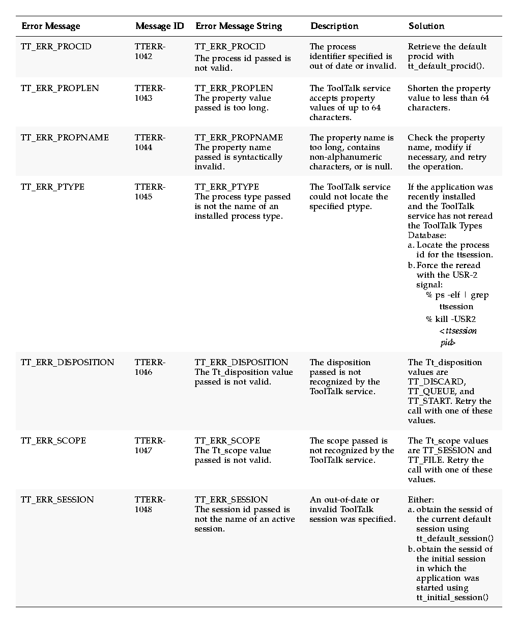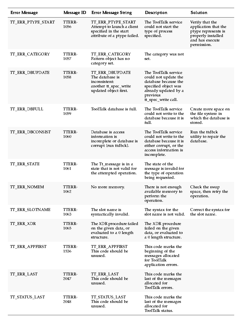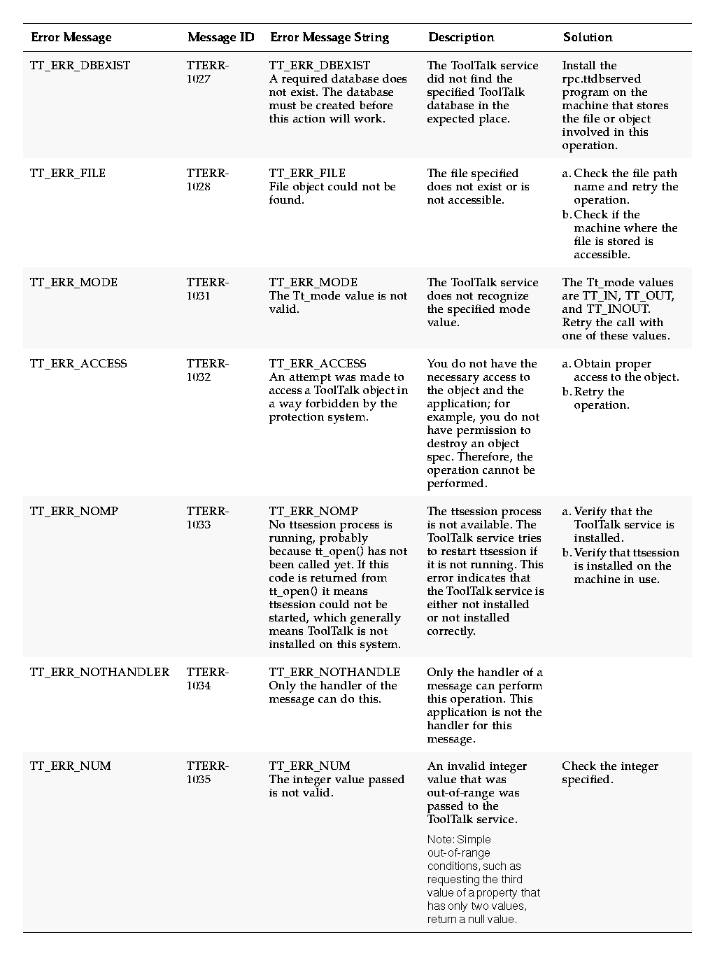 Table 7-1 Alphabetical List of ToolTalk Error Messages