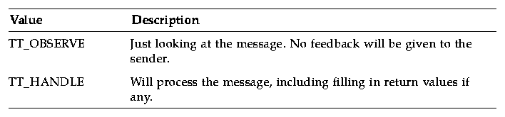 These values are used to specify the action taken by the callback attached to messages or patterns. If no callback returns TT_CALLBACK_PROCESSED, tt_message_receive() will return the message. Table 2-2 describes the possible values.