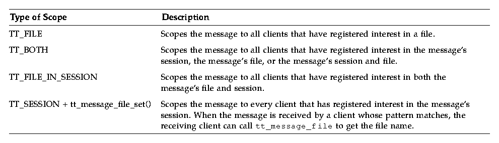 Applications can also scope a message to every client that has registered interest in the message's session by specifying TT_SESSION with tt_message_file_set for the message scope. When the message is received by a client whose pattern matches, the receiving client can get the file name by calling tt_message_file.