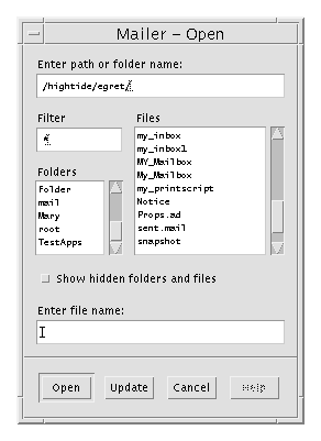 - Enter file name - Type the name of the mailbox or select it from the list. From this type of dialog box you are presented with a place to enter a path or folder name or a place to select from the folders and files in your file system.