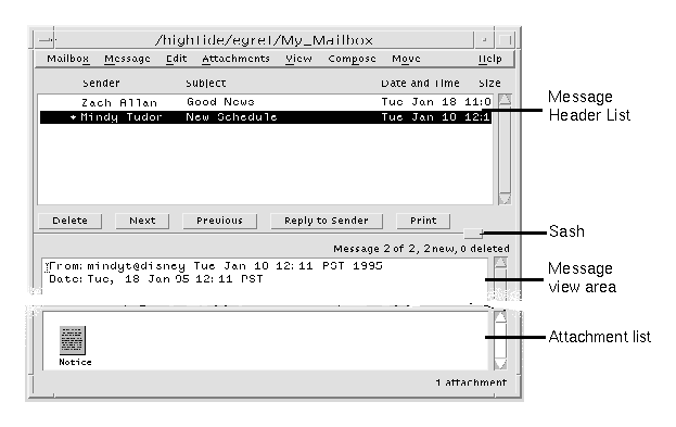 The Mailer main window is shown in Figure 8-2 and described below.