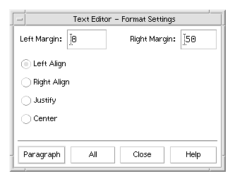 The default left margin is 0 and the right margin is dynamically set to the width of the Text Editor window. Margins are specified as a number of character columns.
