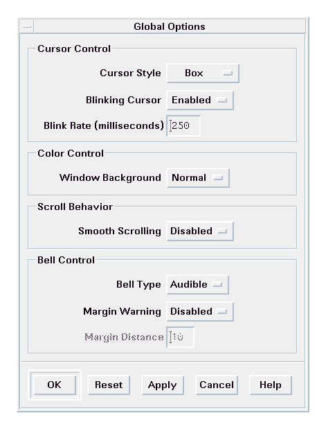 The Margin Distance option is only active when the Margin Warning option is set to Enabled. You set the distance from the right margin of the dtterm window at which you want the bell to ring (or appear, if Bell Type is set to Visible). The default value is 10 characters.