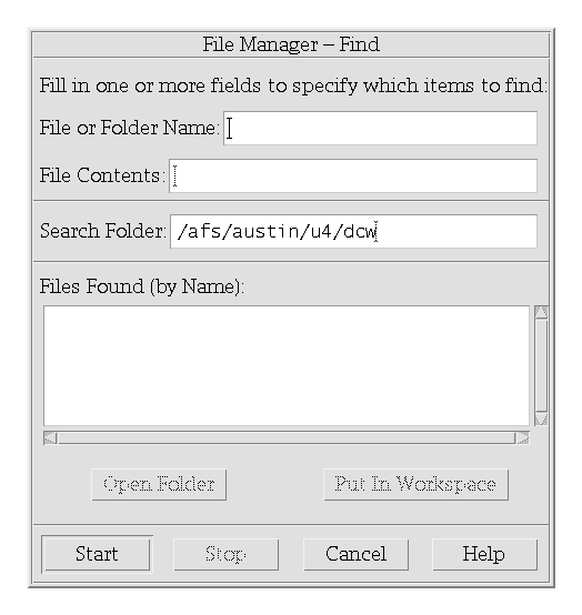 If you enter a partial name (using wildcards) File Manager examines only the files that match the File or Folder Name field. If you leave the File or Folder Name field empty, File Manager searches every file within the search folder. Names can be specified using the same regular expression syntax allowed by the grep command. (Refer to the grep man page for more information.)