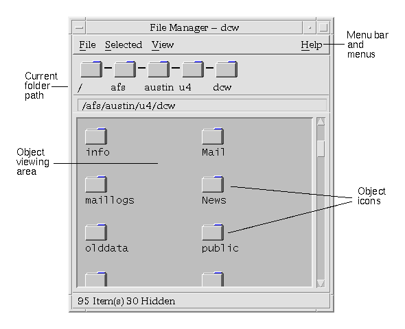 Use File Manager to create, find, and use desktop objects: files, folders, and applications. Each object is represented by an icon in File Manager.