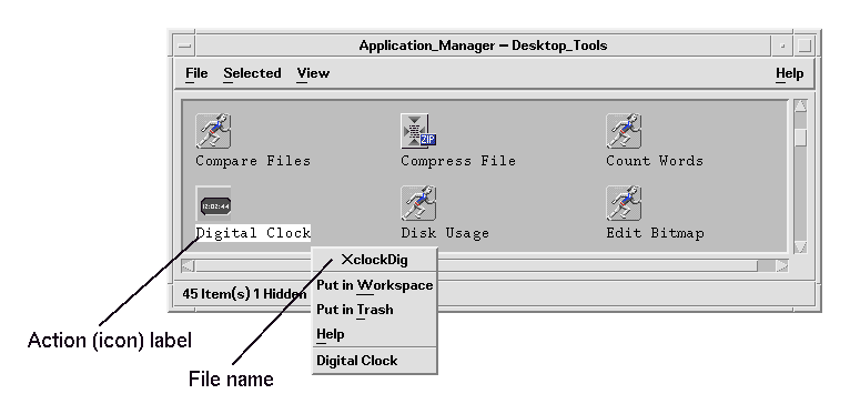 For example, display the pop-up menu for the action icon in the Desktop_Tools application group labeled Digital Clock. Notice that the file name, which is shown at the top of the pop-up menu, is not the same as the label.