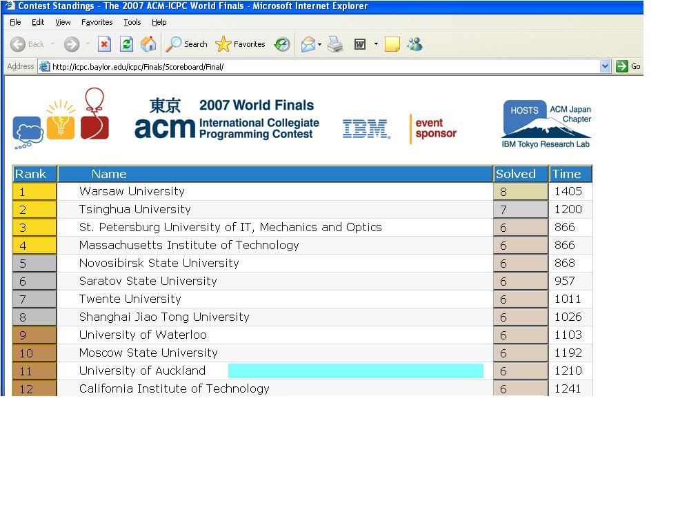 - University of Auckland Team--Heather Macbeth, Matthew Steel, Matthew Gatland, Dr. Michael Dinneen (coach)--reclaimed the South-Pacific Champions title at the 32nd ACM International Collegiate Programming Contest World Finals (April 6-9, 2008. Banff, Canada).